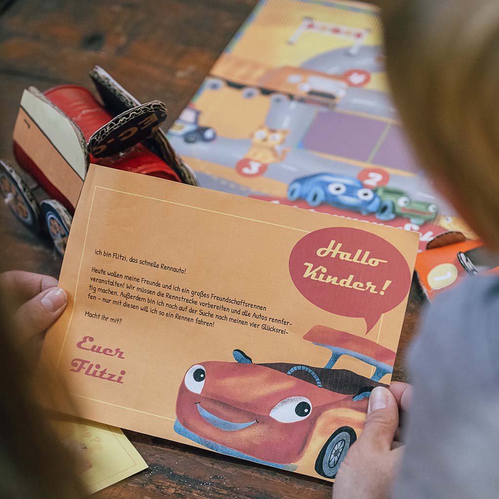 Mit diesem liebevoll gestalteten PDF-Paket erhalten Sie alles, was Sie für das große Freundschaftsrennen mit Flitzi brauchen – inklusive Schatzkarte, Rätseln, Spielideen und einer ausführlichen Anleitung.