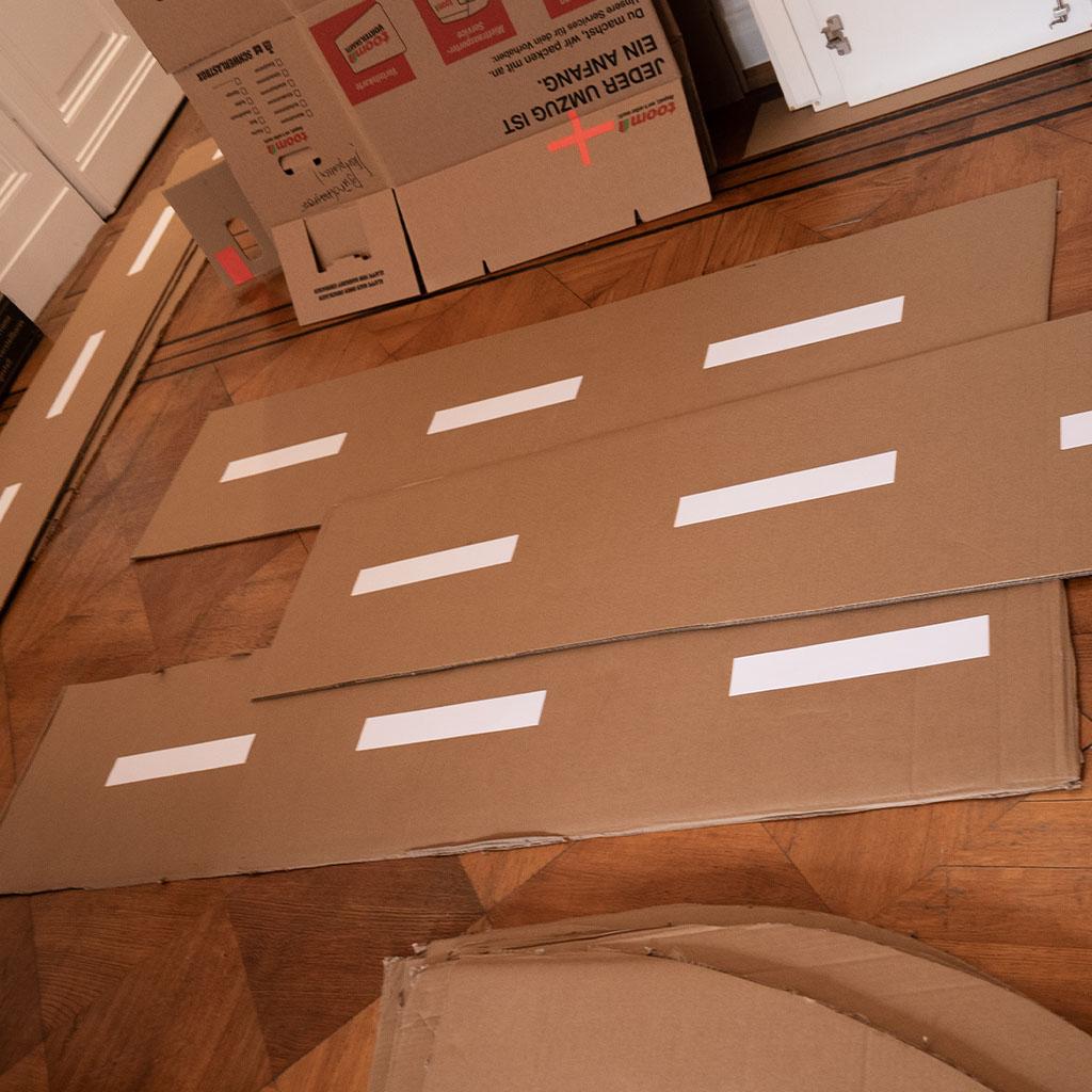 Zuerst ein Hinweis: Für diese Variante brauchen Sie vor allem eines: viel Pappe! Am besten eignet sich das Projekt, wenn Sie ohnehin gerade große Kartons übrig haben – zum Beispiel vom Umzug oder vom Aufbau neuer Möbel. Unsere Pappen stammten übrigens aus einer Schreibtischlieferung. Extra Pappe zu kaufen, lohnt sich nicht – diese Rennbahn ist perfekt zum Wiederverwerten vorhandener Materialien.