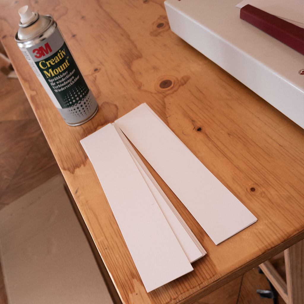 Schneiden Sie zunächst die weißen Mittelstreifen zurecht. Am einfachsten geht das mit einem Schneidbrett – so werden die Streifen gleichmäßig und der Zuschnitt geht schnell. Alternativ können Sie die Streifen auf einem A4-Blatt abmessen und mehrere Blätter gleichzeitig schneiden.