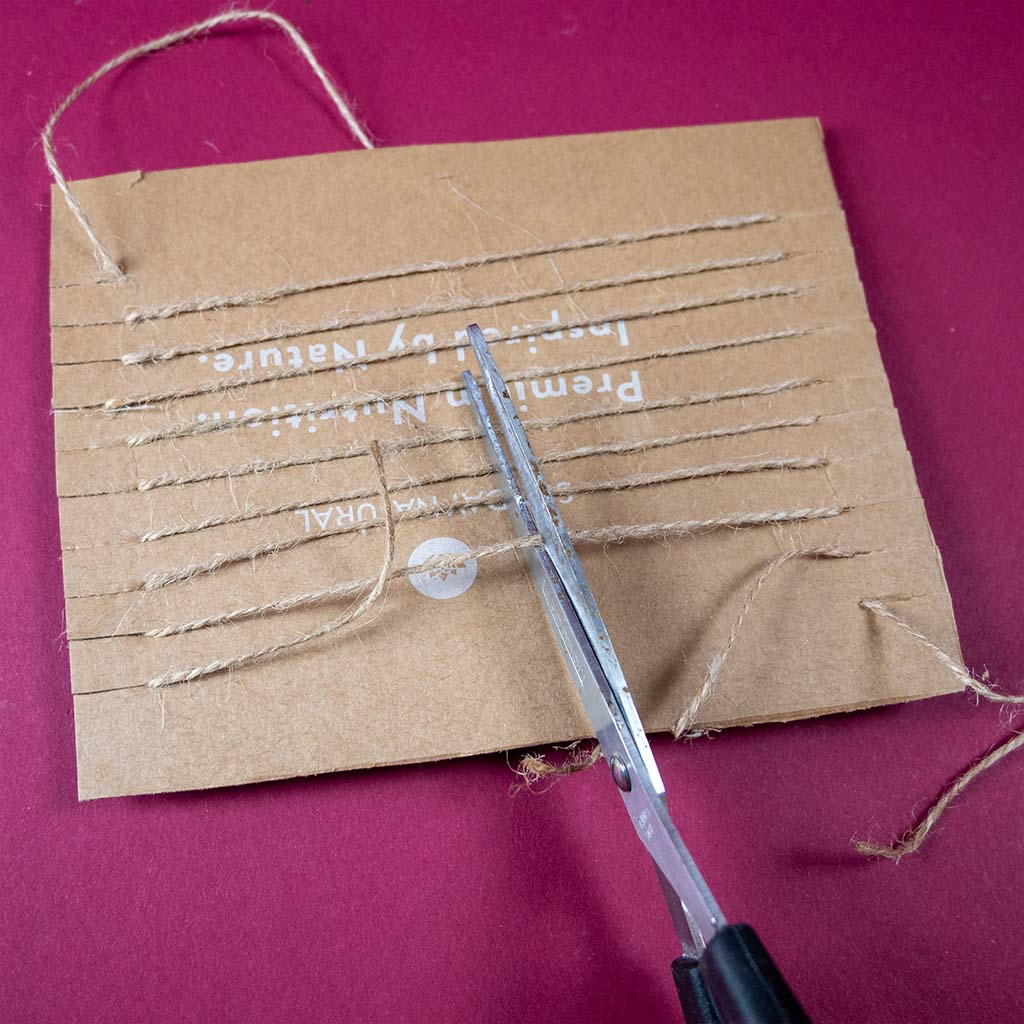 Drehen Sie den Webrahmen um und schneiden Sie die gespannten Fäden auf der Rückseite in der Mitte durch.