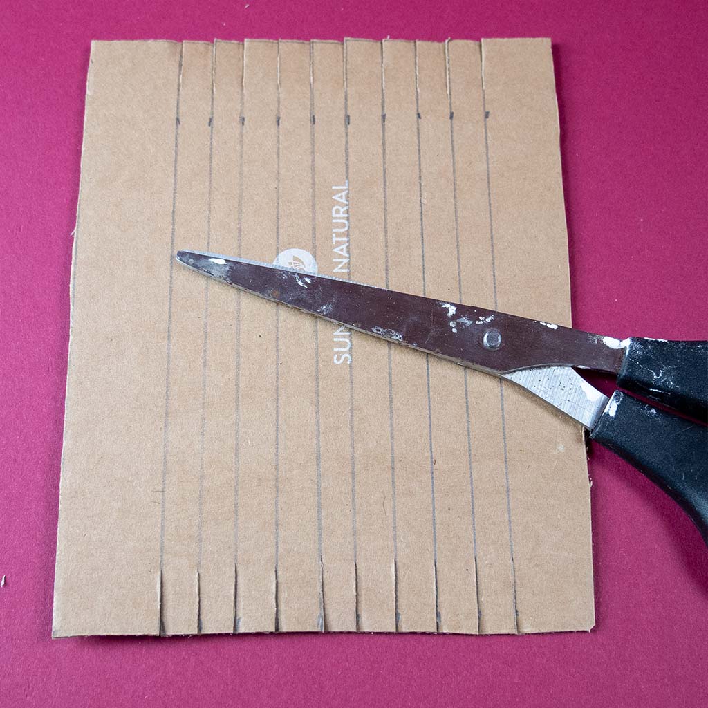 Führen Sie den Faden dort erneut von oben nach unten über die Pappe bis durch den unteren Schlitz. Wiederholen Sie diesen Vorgang, bis alle Schlitze bespannt sind.