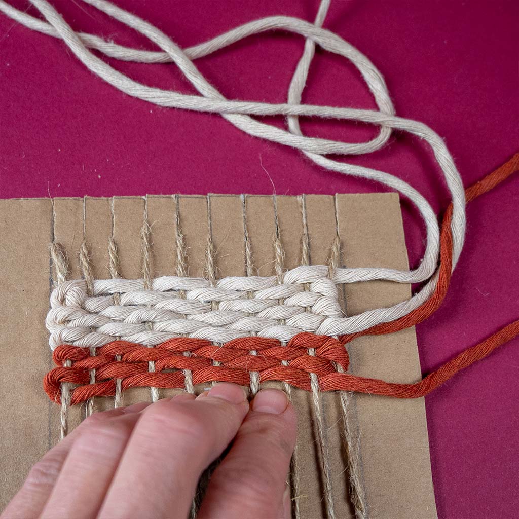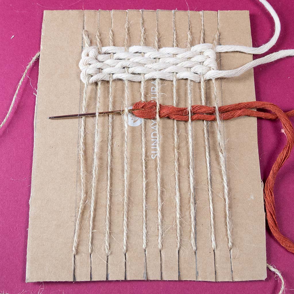 Führen Sie die Nadel quer über die Pappe – immer im Wechsel über einen gespannten Faden, unter dem nächsten hindurch.