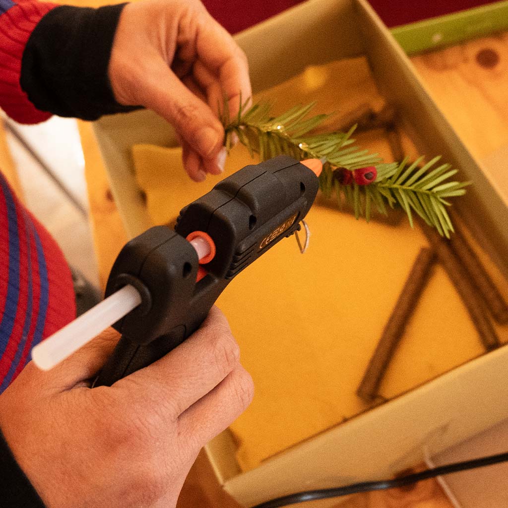 Schneiden Sie den Filz so zu, dass er genau an die Innenwände passt, und kleben Sie ihn anschließend sorgfältig fest. Wenn die Wände ausgekleidet sind, kommt das besondere Detail: kleine Zweige.