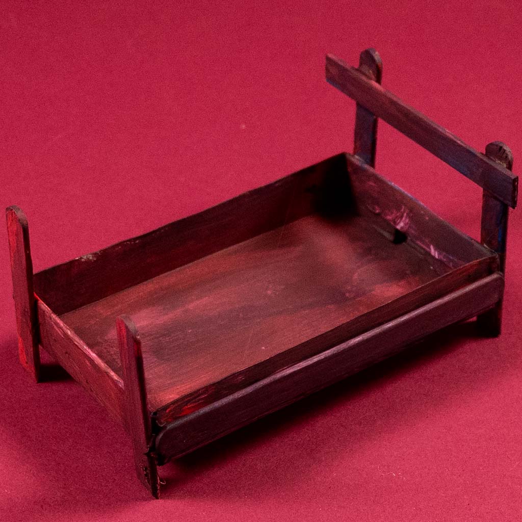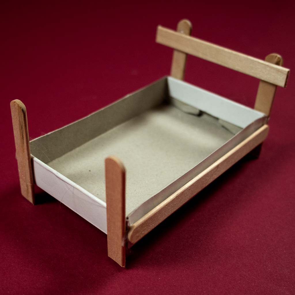 Sobald der Kleber getrocknet ist, bekommt das Bett eine schöne Farbe: warme Holztöne, sanfte Naturfarben oder etwas weihnachtliches wie Rot oder Grün. Sie können das Bett entweder mit Acrylfarbe anmalen oder mit Sprühfarbe einsprühen – je nachdem, was Sie griffbereit haben.