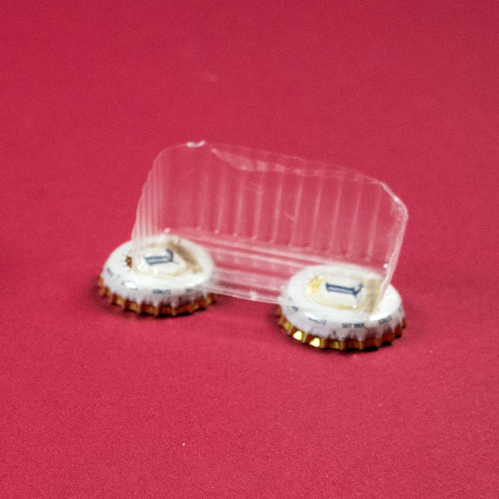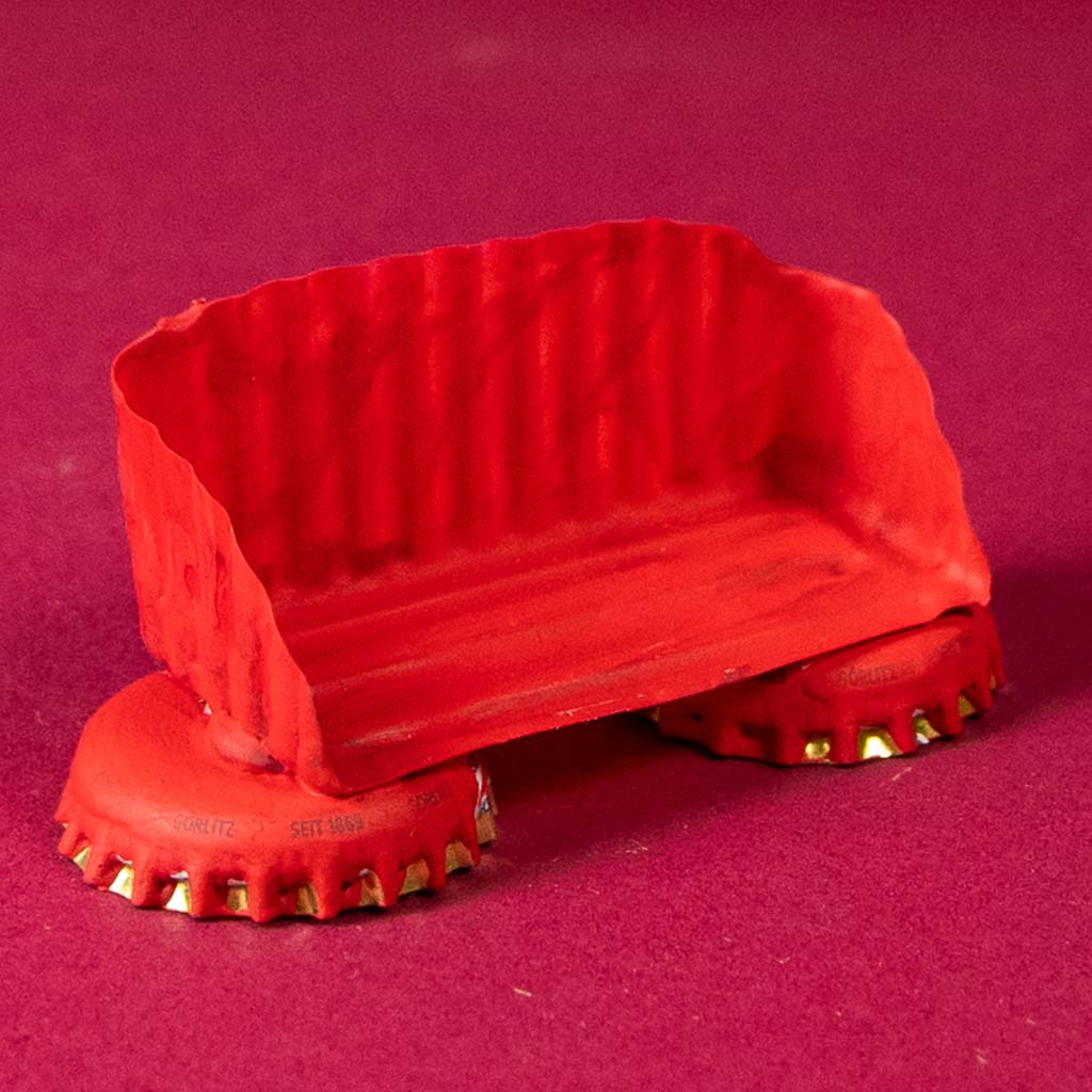 Schneiden Sie aus der Pralinenverpackung ein Stück heraus, das bereits wie eine kleine Couch geformt ist. Viele dieser Einsätze haben von Natur aus eine abgerundete Sitzmulde oder eine kleine Lehne, die sich perfekt eignet. Anschließend kleben Sie zwei Kronkorken als stabile Füße darunter. Dadurch steht das Sofa nicht nur gut, sondern bekommt den typischen „Möbelcharakter“.
