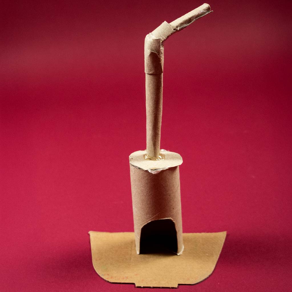 Oben bekommt die Klopapierrolle einen Deckel aus Pappe. Stecken Sie durch diesen Deckel ein kleines Rohr: Entweder rollen Sie dafür ein Stück Pappe zusammen oder verwenden einen Strohhalm mit Knick. So entsteht das typische Kaminrohr, durch das der Rauch hinauszieht.