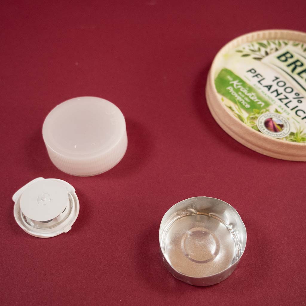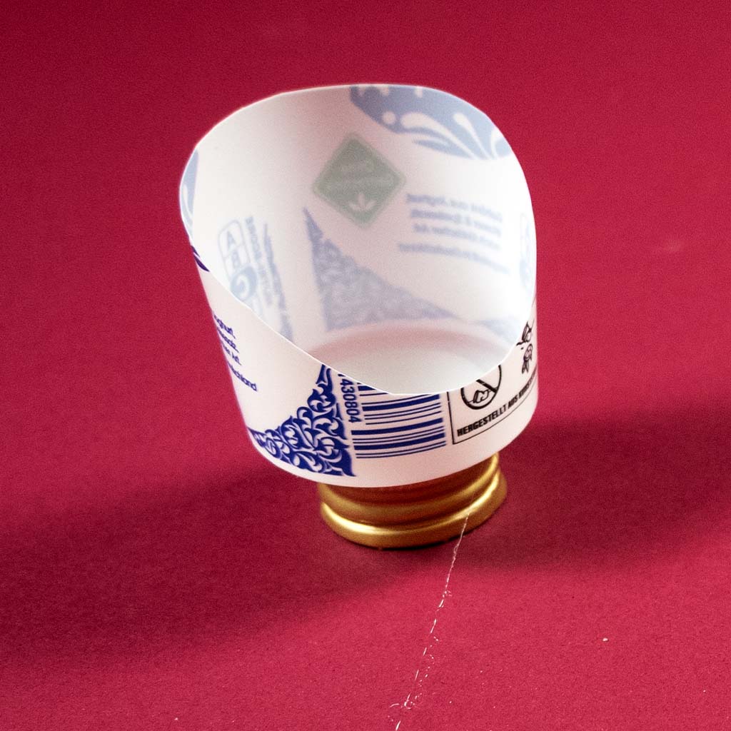 Auch hier nutzen wir einfache Materialien, die sonst im Müll landen würden: einen ausgewaschenen Joghurtbecher und einen Schraubverschluss.